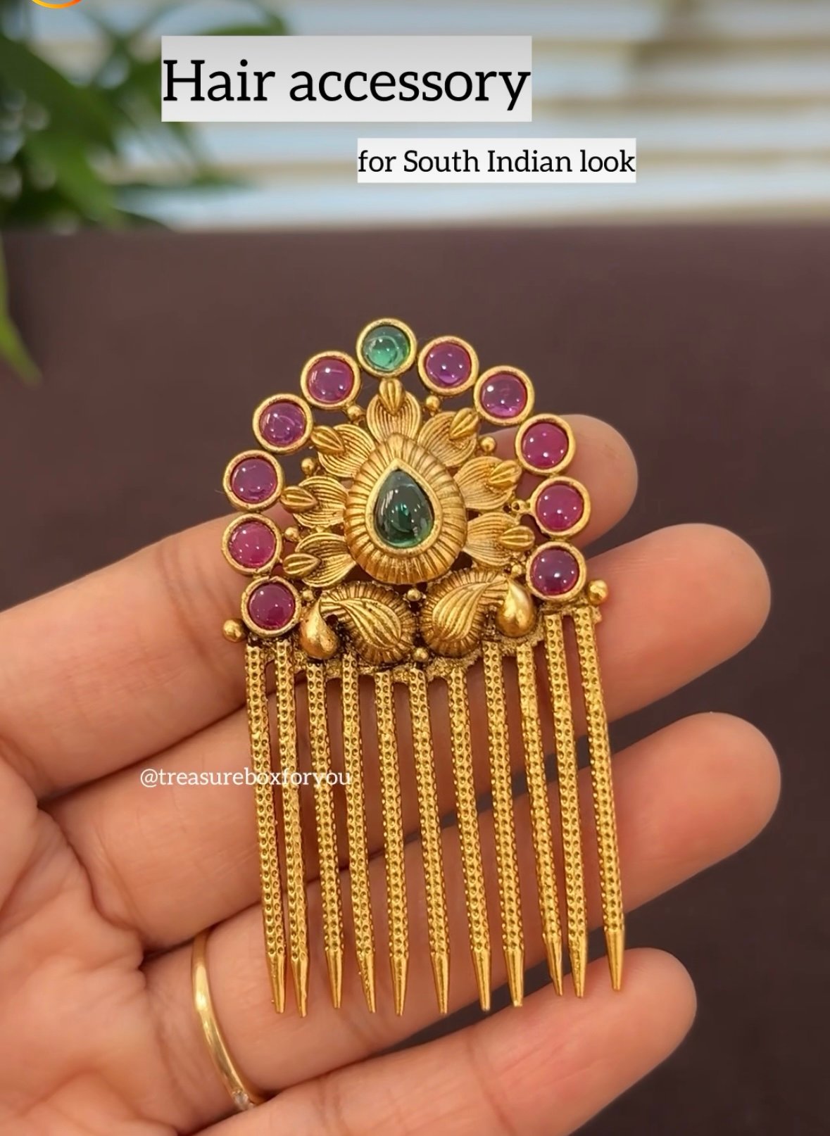 Elegant hair accessory inspired by South Indian temple jewellery. Designed in an antique gold finish, it adds a traditional, graceful touch to buns and braids, half tied hairstyles. Perfect for bridal